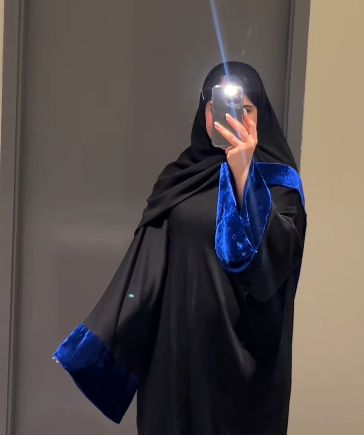 عباية “نص بشت” مصنوعة يدوياً بعناية فائقة من كريب فاخر بانسيابية ناعمة. الأكمام والجزء السفلي مصممة من مخمل فرنسي حرير نقي 100% بلون نيلي داكن يمنح لمسة فخامة هادئة وراقية.