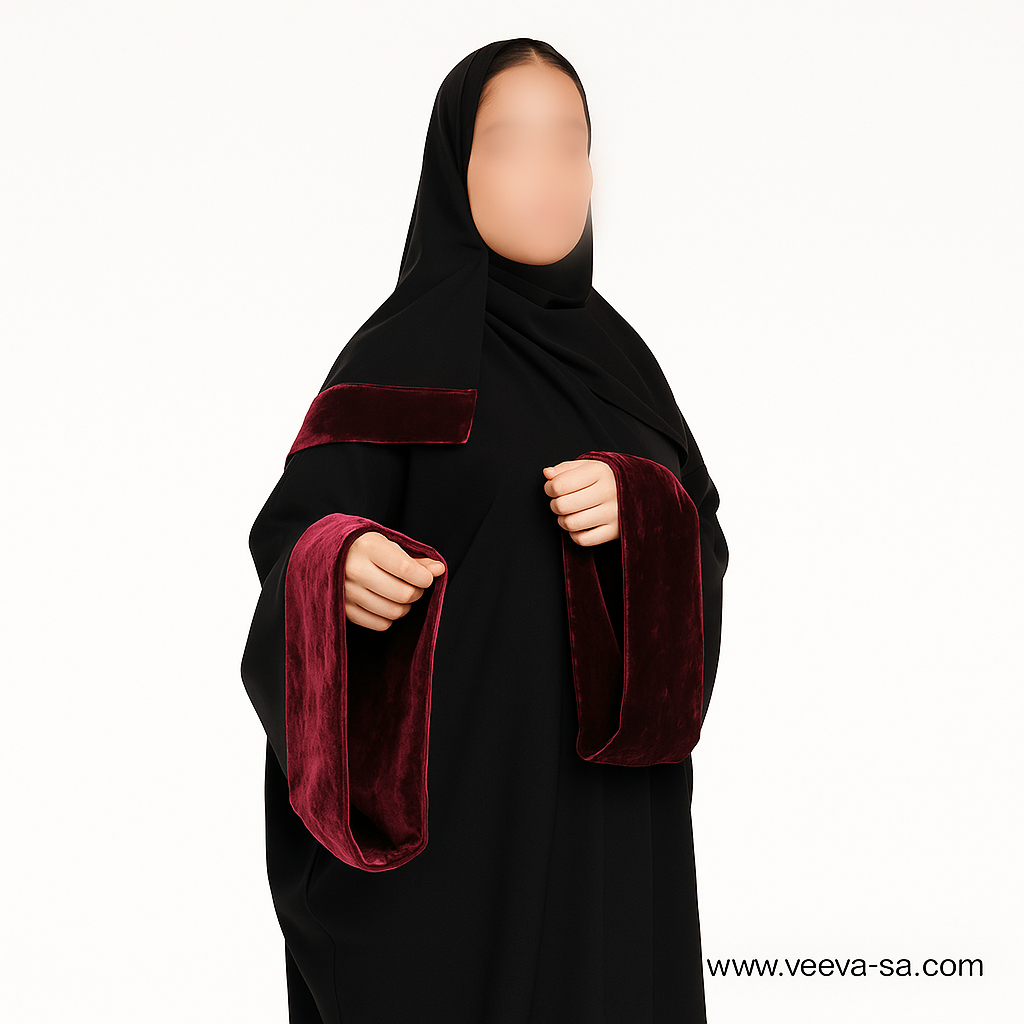 عباية “نص بشت” بتصميم يجمع بين الفخامة والنعومة، مصنوعة يدوياً بعناية فائقة من كريب فاخر بملمس متوازن لا هو ثقيل ولا خفيف. تأتي الأكمام والجزء السفلي بتفاصيل من مخمل فرنسي حرير نقي 100% بلون الفوشي راقي يضيف عمق وأناقة للتصميم.